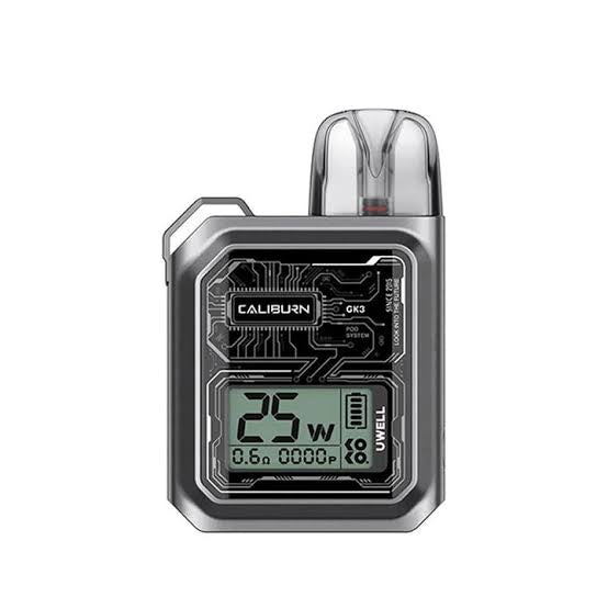 CALIBURN GK3 VAPE KIT-900 mAH The Uwell Caliburn GK3 pod kit is a pocket-friendly vape, ideal for new and seasoned vapers alike. It contains a built-in 900mAh battery, which offers plenty of vaping before needing to be recharged. Delivering a 5-25W power output range, the GK3 is a solid option for both MTL (Mouth To Lung) and RDTL (Restricted Direct To Lung) vaping. This kit is compatible with the refillable Caliburn G3 pods and two 2ml pods are also included to help get you started. Features: 900mAh Built-In Battery 5-25W Output Range MTL And RDTL Vaping Inhale Activation Smart Mode Variable Wattage Mode Adjustable Airflow 2ml Refillable Pods Top-Filling Design Built-In Coils The GK3 boasts single-button operation and you can get started with five quick clicks. When unlocked, vape by either pressing the button or just inhaling on the mouthpiece. The device’s smart, built-in chipset recognises your coil’s resistance and selects the best power output automatically, helping your pods last longer and removing the need for any guesswork. If you’re looking for extra customisation, you can also set a power level manually and discover your perfect vape. However you decide to vape, keep track of power and battery life easily with the GK3’s built-in OLED display. The Caliburn G3 pods hold up to 2ml of e-liquid and boast a simple top-filling design. Refilling your pod is as easy as lifting off the mouthpiece — you don’t even have to remove it from your device, cutting down on a lot of mess. Their built-in coil design saves you even more hassle, as you can just replace the whole pod when the coil inside needs changing. Want to switch between an RDTL and MTL inhale? Simply swap between the 0.6 Ohm and 0.9 Ohm pods, both of which will work best 50% VG e-liquids and higher PG vape juice. Contains: Caliburn GK3 Device 0.6 Ohm Caliburn G3 Pod 0.9 Ohm Caliburn G3 Pod USB-C Charging Cable Lanyard User Manual